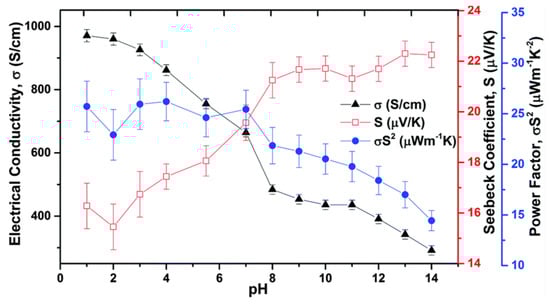 Effect of pH on Seebeck coefficient, conductivity, and power factor of PEDOT:Tos films [53].