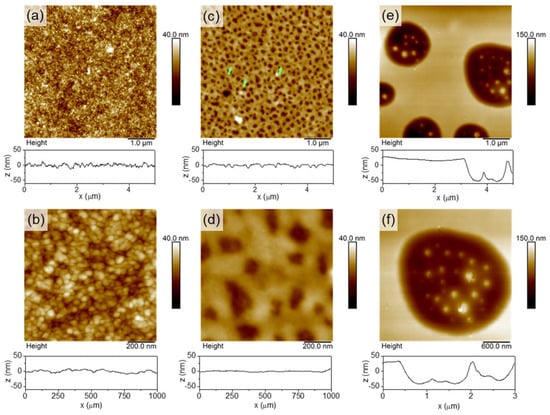 AFM topography of THF-treated PEDOT:PSS films. (a,b) pristine sample, (c,d) after short interaction times (te ≪ 1 min), and (e,f) after long interaction times (te = 10 min). A topography cross-section, taken at the center of each image, is presented below each ffgure [69].