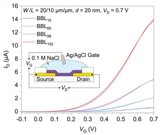 Transfer characteristics of BBL15, BBL60, BBL98, and BBL152-based OECTs (Voltammetry curves of BBL with different molecular weights). Inset: cross-sectional schematic of the OECTs [77].