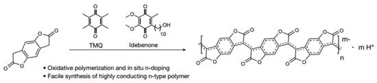 As an emerging n-type organic material, PBFDO exhibits excellent thermoelectric properties, solution conductivity exceeding 2000 S cm−1, and excellent stability and solution processability. Huang et al. applied oxidative polymerization and in situ reductive n-doping to significantly improve the doping efficiency (the doping level of each repeating unit was close to 0.9 charges) and prepared a rigid conjugate skeleton with a high doping level, as shown in Figure 7 [80]. It is worth noting that the polymer had no side chains, which was convenient for further operations such as side chain modification.