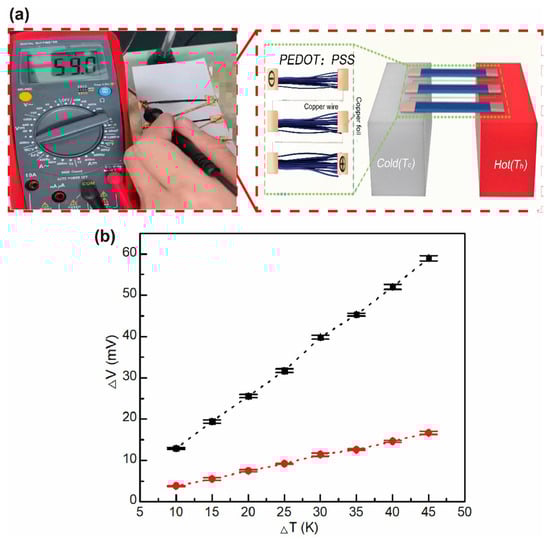 - Jiang, K.; Hong, S.H.; Tung, S.H.; Liu, C.L. Effects of cation size on thermoelectricity of PEDOT: PSS/ionic liquid hybrid films for wearable thermoelectric generator application. J. Mater. Chem. A 2022, 10, 18792–18802. [Google Scholar] [CrossRef]