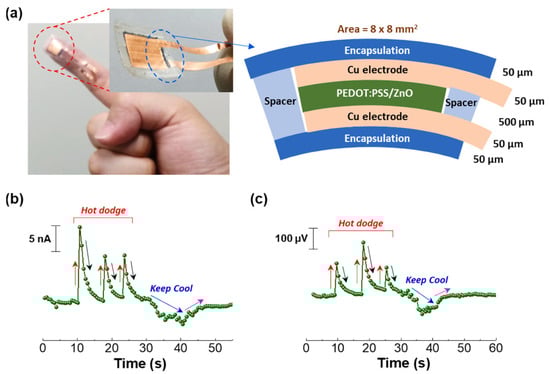(a) A fingertip-mounted flexible thermal sensor based on PEDOT:PSS/ZnO hybrid composite sheets (ZnO content = 70 wt%) (right: cross-sectional structure). (b) Current and (c) voltage responses of the flexible thermal sensor as it is moved towards heat and cold sources (red arrow: near heat source; black arrow: moving away from heat source; blue arrow: close to the cold source; pink arrow: moving from cold source) [103].