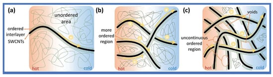 Schematic diagram of electron transport in composite films: (a) SWCNTs < 10 wt%, (b) SWCNTs > 10 wt%, and (c) SWCNTs > 90 wt% [106].