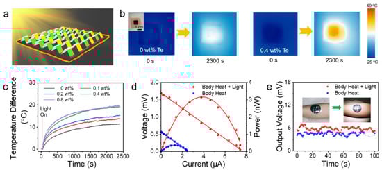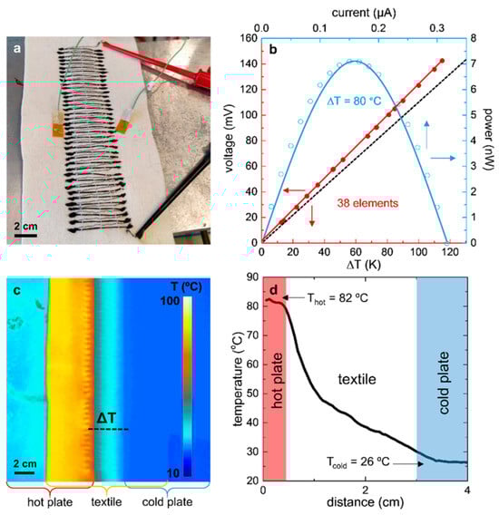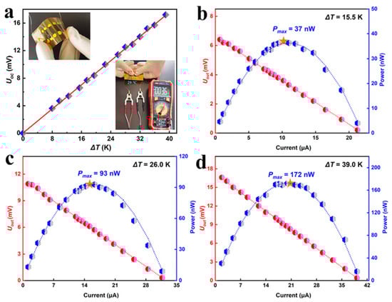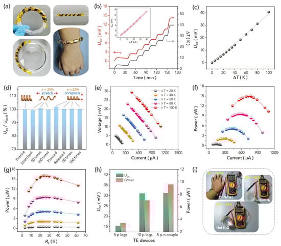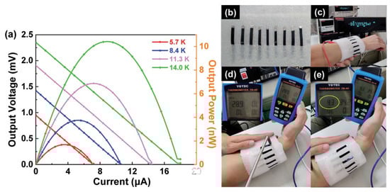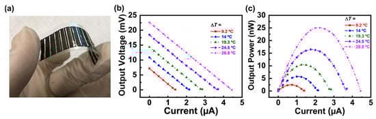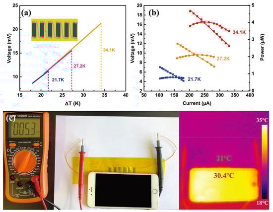 Properties of six-leg thermoelectric generator (TEG) manufactured with the film. (a) Open-circuit voltage at different ΔT values (illustrated as schematic diagram of f-TEG). (b) The measured voltage and output power at different applied currents and ΔT values. (c) Photo of 5.3 mV voltage generated by ΔT between the just-used mobile phone and the surrounding environment (corresponding infrared thermal image on the right) [108].
