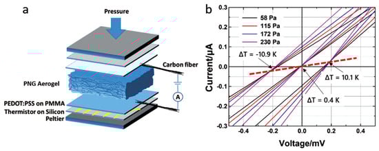 (a) Schematic diagram of a sensor device prepared with PNG aerogel. (b) Current−voltage curves measured at different temperatures and pressures [110].