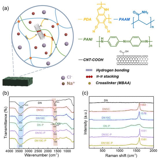 (a) Structure of PDA/CNT/PAAM/PANI hydrogels with four different chemical structures. (b) FTIR and (c) Raman spectroscopy of the hydrogels [111].