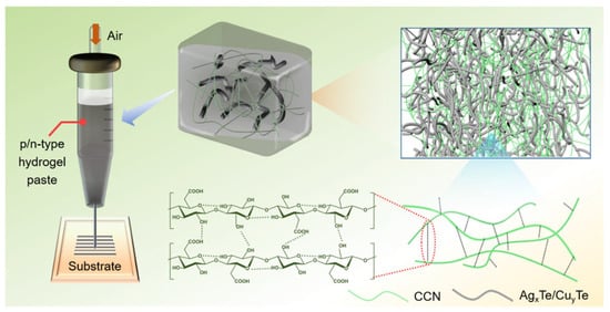 - Wu, B.; Geng, J.; Lin, Y.; Hou, C.; Zhang, Q.; Li, Y.; Wang, H. Hydrogel-based printing strategy for high-performance flexible thermoelectric generators. Nanoscale 2022, 14, 16857–16864. [Google Scholar] [CrossRef]