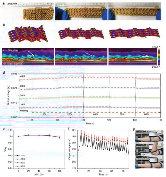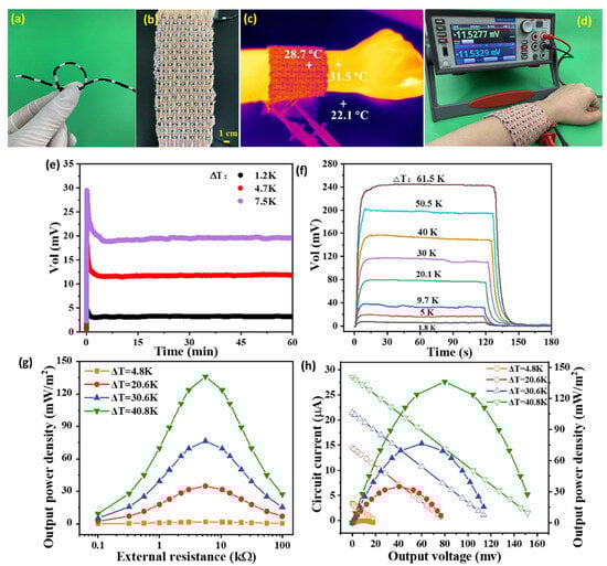 Zheng et al. reported a strategy for the efficient preparation of fiber/yarn-based thermoelectric textiles with a high output power, and the three-dimensional textiles also showed quite good flexibility under bending, twisting and compression, as shown in Figure 9 [101]. CNT yarns were subsequently dipped into an aqueous PEDOT:PSS solution and PEI/ethanol solution to form the periodic units of p-legs and n-legs. Thermoelectric textiles were then obtained by knitting the thermoelectric yarns into the weft-knitted spacer fabric. Under the condition of ΔT = 47.5 K, the output power density of the thermoelectric textile was higher than 50 mW m−1 K−2, and the specific power density was as high as 171.7 μW g−1 K−1.