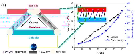 - Hasan, M.N.; Ahmad Asri, M.I.; Saleh, T.; Muthalif, A.G.; Mohamed Ali, M.S. Wearable thermoelectric generator with vertically aligned PEDOT: PSS and carbon nanotubes thermoelements for energy harvesting. Int. J. Energy Res. 2022, 46, 15824–15836. [Google Scholar] [CrossRef]