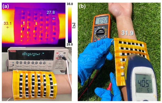 Thin films have been widely studied because of their simple preparation process. Interactions between the sulfonic acid groups in PSS and the hydroxyl groups (and/or zinc cations) in ZnO cause an increase in the viscosity of PEDOT:PSS aqueous solutions upon ZnO particle integration. This leads to improved thermoelectric properties in ZnO/PEDOT:PSS composites when compared to unmodified PEDOT:PSS. Lee and colleagues examined the morphological and compositional nuances of PEDOT:PSS composite films containing ZnO particles of varying sizes (0.1, 5, and 45 μm) [103]. It was found that composites with a 70 wt% concentration of 45 μm ZnO particles achieved a power factor of 1.7 × 10−6 μW m−1 K−2 at ΔT = 50 K. Furthermore, wearable thermal sensors using these PEDOT:PSS/ZnO composite films demonstrated rapid thermoelectric responses to heat and cooling sources, as depicted in Figure 10 [103].