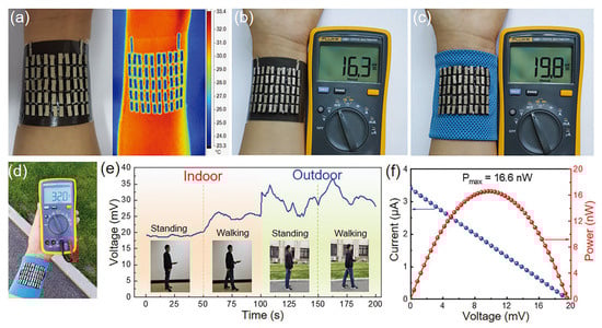When the wearable thermoelectric device is attached to the human body, the contacted skin can be regarded as a constant heat source. With the relatively low temperature difference between the skin and atmosphere, thermoelectric devices convert this low-grade heat into electricity, which can power WEDs or work as a temperature sensor. For example, thermoelectric materials can be used as sensors with high measurement accuracy, which can sense subtle changes in the human body and output effective information. Chen et al. reported a large strain hydrogel thermoelectric device that can continuously and spontaneously supply power and monitor human movement at ambient temperature [26]. Liu et al. prepared flexible thermoelectric composite fabrics by electrospinning polylactic acid with carbon nanotubes (CNTs). The device has excellent durability and thermoelectric conversion efficiency [27].