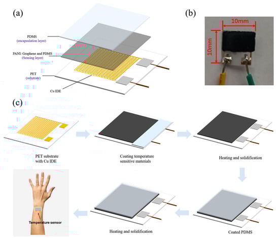 - Liu, H.; Sun, K.; Guo, X.-L.; Liu, Z.-L.; Wang, Y.-H.; Yang, Y.; Yu, D.; Li, Y.-T.; Ren, T.-L. An Ultrahigh Linear Sensitive Temperature Sensor Based on PANI:Graphene and PDMS Hybrid with Negative Temperature Compensation. ACS Nano 2022, 16, 21527–21535. [Google Scholar] [CrossRef]