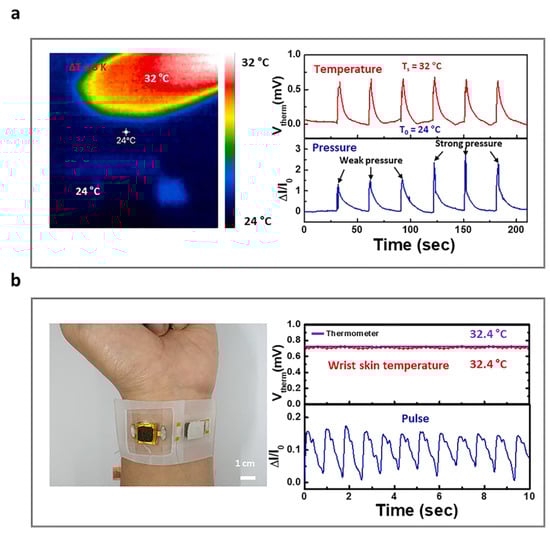 - Zhu, P.; Wang, Y.; Sheng, M.; Wang, Y.; Yu, Y.; Deng, Y. A flexible active dual-parameter sensor for sensitive temperature and physiological signal monitoring via integrating thermoelectric and piezoelectric conversion. J. Mater. Chem. A 2019, 7, 8258–8267. [Google Scholar] [CrossRef]