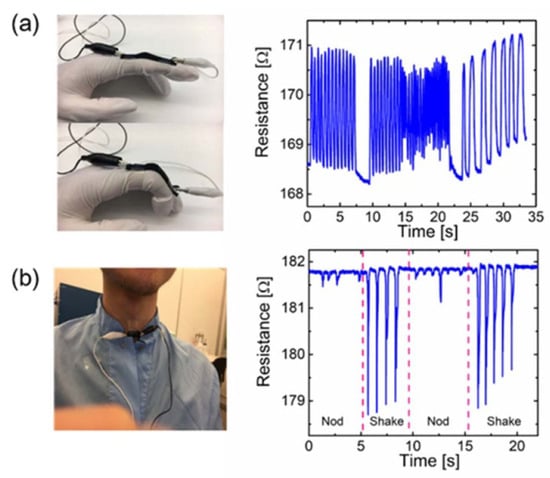 Wearable electronic devices (WEDs) are a class of electronic devices that come into direct contact with skin or clothing, and are often used to collect human vital signs or expand the capabilities of people with physical disabilities. Therefore, WEDs are considered as one of the research hotspots in the 21st century. In the field of healthcare, WEDs collect body signals such as temperature, heart rate, and blood oxygen saturation, which can help ordinary people in assessing their daily health or assist doctors in making clinical diagnoses. WEDs can also be applied to artificial intelligence-based robots, and to establish human-like perceptual abilities. As shown in Figure 1, here are different kinds of WEDs, including electronic skin [1,2,3], cochlear implants [4], cardiac pacemakers [5], smart glasses [6,7,8], mouth guards [9], and other devices that can monitor, prevent, and even repair damage to human tissue. For instance, Yokota et al. reported a type of organic electronic skin consisting of a three-color, high-efficiency polymer light-emitting diode (PLED) and an organic photodetector (OPD), which was thinner than human skin. This electronic skin is flexible and stretchable, and can visually display the oxygen concentration in blood in real time [1]. This study is of significant importance for the health monitoring of athletes in extreme sports. Han et al. reported a novel implantable pacemaker, which consisted of three parts, namely, an energy harvesting unit, power management unit (PMU), and pacemaker unit [5]. It can effectively correct or prevent cardiac diseases such as sinus arrhythmia. Wang et al. developed a compact wearable device that enables self-sufficient, pseudo-continuous, and low-intrusion tracking of blood glucose levels based on a shape memory alloy (SMA) actuator [10]. Xiao et al. prepared a sensor based on Uircase@MAF-7 using a metal–organic framework (MOF), which can accurately and sensitively detect uric acid (UA) concentrations in sweat. This was achieved by combining a pliable microfluidic chip with a wireless electronic detection unit [11]. As shown by the studies mentioned above, WEDs hold great potential for application in human healthcare.
