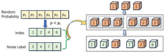 The construction of the denoising query consists of two main components: labeling noise and 3D box noise. Additionally, this algorithm applies various noise addition scenarios to the ground truth (GT), as illustrated in Figure 6. Specifically, assuming a batch of data contains d real GT values repeated n times to construct n groups of different denoising queries, the total number of denoising queries is n×d, which is denoted by D. For label noise addition, the algorithm first generates D probability values conforming to a normal distribution. It then uses a preset probability p to screen k indexes of D probability values that are smaller than p. Next, k positive integers representing random labels within the range of the number of categories are generated. These k random labels are then adjusted according to the indexes, thus modifying the values at the real label locations after n repetitions to the labels with added noise. Finally, a fully connected layer encodes this noise query to obtain the noise query .