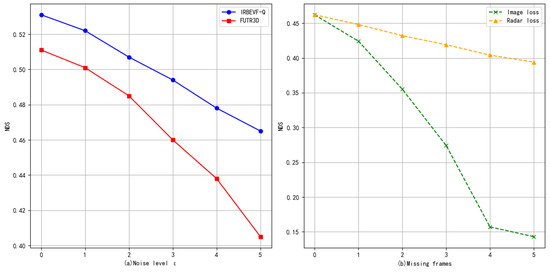 Noise and sensor failures are critical considerations in the operation of autonomous vehicles. We deliberately introduced noise and simulated experiments to address passive sensor failures. As seen in Figure 8a, noise was added to the projection matrix, with higher noise levels resulting in increased noise. Subsequently, as seen in Figure 8b, experiments involved the removal (or filling with zero matrices) of six image inputs and five radar inputs. As depicted in Figure 8a, when employing IRBEVF-Q and another outstanding 3D detection approach, FUTR3D, we observe that higher errors in the camera’s external reference led to more significant performance degradation. However, for the same level of noise error, the performance degradation of IRBEVF-Q compared to FUTR3D was less pronounced, thus indicating that IRBEVF-Q exhibits greater resilience to interference and enhancing the model’s robustness. From Figure 8b, we observe that both the loss of image frames and the loss of radar frames impacted the model’s performance. However, the impact of losing image frames is considerably larger than that of losing radar frames. This discrepancy arises from the high resolution and rich semantic information provided by images, which are crucial for model performance, whereas radar signals, with their lower resolution, serve primarily as supplementary information.
