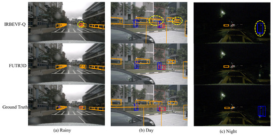 In Figure 9, we compare and analyze the 3D detection results of the open source radar–vision fusion detection work FUTR3D and the IRBEVF-Q model in this paper in the same scene. (a) In rainy days and nights when the camera image is not clear, our IRBEVF-Q can predict more and more effective information. First, the radar information brings more potentially useful features, and second, the radar image fusion method has a better effect. (b) In sunny weather, our IRBEVF-Q is more accurate in predicting occluded and truncated objects. The distance information brought by the radar brings a gain to the prediction after passing through our fusion method, which better overcomes the disadvantage of the image in predicting occluded objects. Figure 10 further contrasts the detection results of IRBEVF and IRBEVF-Q in the BEV view. Notably, IRBEVF-Q exhibited more accurate location predictions compared to IRBEVF, and it successfully anticipated a greater number of potential objects at a distance, thus facilitating road comprehension for autonomous vehicles.