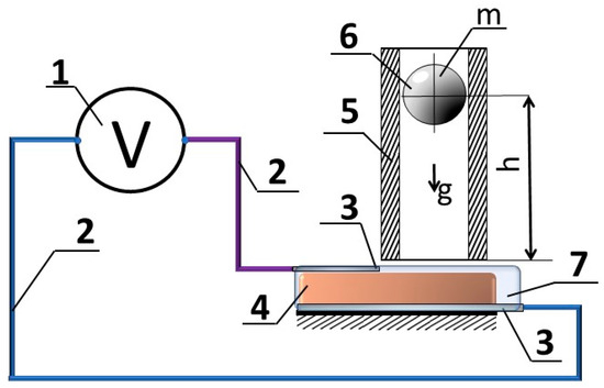 Visual representation of experiment: 1—oscilloscope as voltage registering device; 2—connecting wires; 3—electrodes; 4—CG film with Fe2O3; 5—plastic tube of selected height: 0.15 m, 0.3 m, 0.6 m, 0.9 m; 6—stainless steel ball: 0.007 kg; 7—lamination.