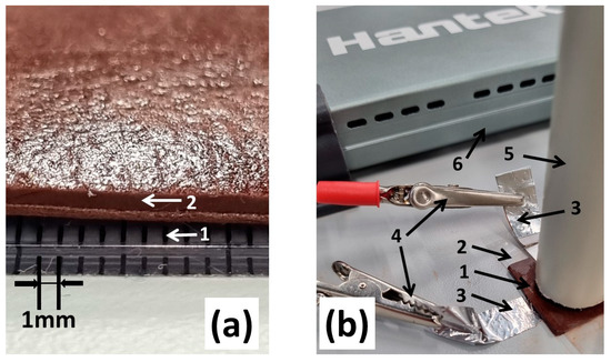 Visual representation of carrageenan film prepared for applied force measurements. (a) carrageenan/ iron oxide film cross-section before experiment: 1—ruler; 2—carrageenan/iron oxide film. (b) Mounting of sample for the applied force experiment: 1—carrageenan film; 2—lamination by parafilm; 3—aluminium electrodes 10 × 25 × 1 mm; 4—connectors of the oscilloscope; 5—guiding tube for falling ball; 6—Hantek DSO 6082BE digital oscilloscope.