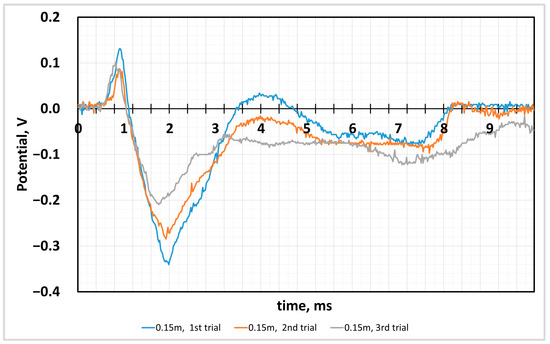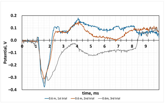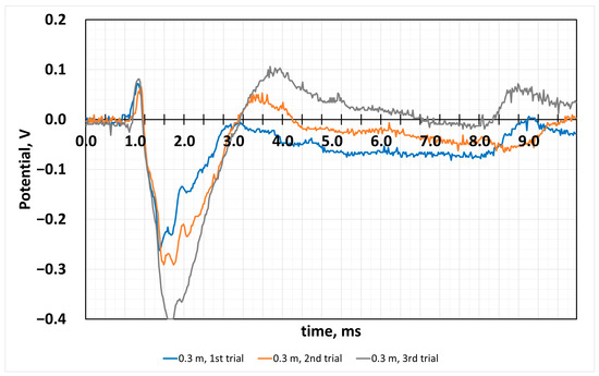 The distance of the 0.3 m of falling ball (Figure 4) resulted in a similar value at the first contact moment, and it is about 0.1 V, but the next peak shows that the reaction of the film can be attributed to the physicochemical nature of the proton-transferring CG and semiconductor iron oxide. Fatigue causes a different response than at shorter distances, and this raises additional questions to explain this effect. As we can see from this experiment, the potential values of the film reaction to the hit differ compared to the distance to the drop ball, by two times less. The potential value in the negative potential values reached −0.4 V in the third curve, and after the values decreased, this can be attributed to the fatigue of the sample. However, the potential increases later to positive potential values, when the total numerical value from the most negative to the most positive reaches almost 0.45 V, which is plenty efficient for 1 mm thick film.