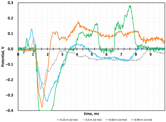 When the ball is thrown from 4 times the initial height (Figure 5), we observe the following changes in potential: at the impact moment, the positive potential of about 0.05 V is registered, and later, the potential increases in the negative values and reaches −0.38 V. After the ball bounces further, the values in the positive range of potential reach 0.18 V, and the initial impact is already higher.