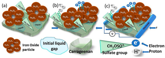 As we can see in the SEM images, the structure of carrageenan film contains iron oxide in trigonal crystalized hydrophilic powder [93,94]. Materials containing iron oxides exhibit sensibility to compression because of a large amount of defects in their structure, such as ion vacancy, and some impurities make them act as a semiconductor [95]. Iron oxide, under mechanical load at ambient pressure, demonstrates measurable electron hopping between iron octahedral sites, resulting in a charge transfer in iron-rich phases [96]. R. Morris [96] declares that electronic exchange between divalent and trivalent iron ions is registered in a compression of less than 7% of volume, and a small amount of Fe3+ is responsible for electrons hopping. The electrical resistance of the powder of structured material depends on the porosity, and with increasing pressure, porosity reduces and electrical resistance is lower [97]. Due to the friction between particles, applied pressure can force the descaling of the dielectric layers, when the powder structure is two layers: inside metal and outside metal oxide. These two phenomena enable an effective decrease in resistivity by increasing the pressure in the powder [97]. Thus, the iron oxide powder already provides a good response to the impact of applied force. Based on this information represented in the articles mentioned above in the text, we presented a visual representation of the possible charge generation and charge transfer when a ball hits a carrageenan film. Visual representation of charge generation during mechanical force hit to the surface of carrageenan film is presented in Figure 8. As it was discussed, the cross-linked carrageenan molecules have sulfate groups, which are involved in charge transfer, making the carrageenan the proton conductive material. Another charge-transferring material is iron (oxide) particles. The compression results in iron (III) oxide particles approximation, causing the free electrons to move. At the point of contact between carrageenan film and iron (III) oxide particles (Figure 7) some gaps remain, which are filled with initial solution residues, and this liquid in the gaps participates as another phase in which hydrogen ions or so-called protons are easily transported. Thus, a heterogenous and very complex system composed of several different charge-transferring materials constitutes the proposed force sensor film.