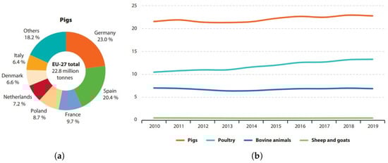 Livestock statistics from the European Union. (a) Distribution of pig meat production in 2019. (b) Production of different meat products in the EU, million tonnes. Source: Agriculture, forestry and fishery statistics [1]. Data source: Eurostat.
