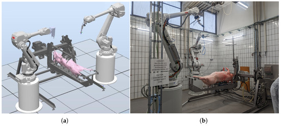 Early conceptual simulated setup of the Meat Factory Cell (a), and the real MFC at the Max Rubner Institute, Kulmbach, Germany (b). The Carcass Handling Unit is holding and manipulating the attached carcass, and the two robots are equipped with intelligent end-of-arm-toolings: RGB-D camera, knife/saw and gripper. (Simulation made with RobotStudio (v2021, ABB Ltd, Zürich, Switzerland), image credit: Óbuda University [28]).