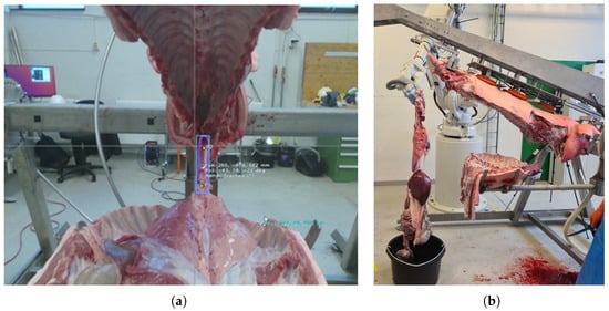 The smart gripper was originally designed to handle the evisceration process in the MFC; however, the final version is capable of performing many more gripping tasks in automated meat processing plants. According to the MeaTable concept (described in detail in [26]), the evisceration process starts after the limbs are removed, the sides of the pig are cut along and the connective tissue below the spine is cut (see Figure 4a). In this state of the carcass, the trachea has to be grasped below the larynx, since all the inner organs (the pluck and the intestines) can be pulled out of the belly by the grasped trachea with only a few assisting cuts (see Figure 4b). The primary requirement is robust, image-guided grasping of soft objects, emphasizing that the robustness and reliability of the grasp are significantly more important than the quality of the grip.