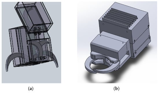 In summary, with respect to the mechanical aspects, the second version of the gripper became sleeker, adapting better to the task and the environment, and its overall dimensions became 70 × 100 × 350 mm. The gripper is mechanically separated into two easily detachable parts—the rear part contains the stepper motor and the power electronics, and the frontal one contains the sensors, the controller, the camera, etc. In addition to the worm gear, an additional internal gear was added with a 20:61 transmission ratio, resulting in a total of 2:183 torque-increasing transmission ratio between the motor shaft and the fingers. A significantly stronger motor (1.9 Nm instead of the 0.56 Nm) was chosen to provide a more reliable grasp when a large amount of tissue remains around the trachea, but thanks to the gripping force feedback, the chance of tissue damage due to too strong grasp remained low. The connections between the parts of the housing are sealed, and the moving parts are designed with simmering sealing as well; thus, the gripper is cleanable with standard industrial methods.