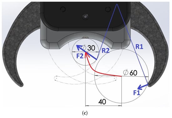 CAD models constructed during the design process of the gripper prototype. (a) The 1st conceptual design with 2 × 2 fingers and a cutting blade. (b) The final CAD model of the 1st prototype. (c) The finger design allows the grasping of objects up to 60 mm in diameter, with up to 40 mm radial displacement. The red arrow shows the constrained motion of the target object due to the synchronized encircling motion of the fingers. Furthermore, due to the constant closing torque and the decreasing lever arm (R2 < R1), the clamping force increases (F2 > F1) when the soft tissue is squeezed between the fingers, ensuring that a shape-locking grasp is achieved.