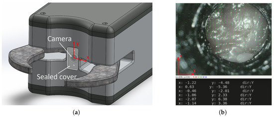 To detect slippage, and furthermore, to potentially prevent the dropping of the grasped object, the gripper was designed with an integrated endoscopic camera (resolution: 640 × 480, 30 Frames per Second (FPS), 2 cm focus, 70° view angle, built-in LEDs). The camera is placed at the front of the gripper, as shown in Figure 7a. Thanks to the centralizing effect of the synchronized motion of the fingers, the grasped object is guaranteed to be pressed against the sealed polycarbonate cover plate in front of the camera. Although this design does not ensure a clear and sharp image, the cover plate stays clean enough for optical flow calculation thanks to the mandatory frequent washing of the whole gripper. The endoscopic camera is placed 2 cm behind the frontal surface of the cover plate, and thus, the surface of the grasped object is always in the focal plane of the camera. Six built-in LEDs around the camera lens provide sufficient illumination, even when the grasped object blocks all external light.