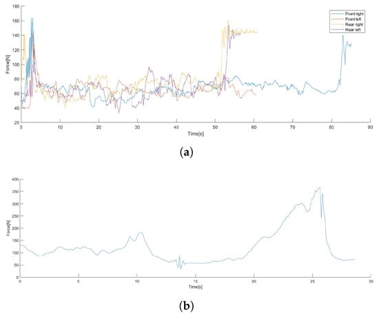 Resultant force data acquired during manual pig cuttings with the gripper prototype. (a) Plot of the forces measured during the cutting of the 4 limbs. (b) Plot of the forces acting during the evisceration process by pulling the trachea without any cuts made. At the peak force value (about 350 N at T = 26 s), the trachea cracked, resulting in some oscillation and then a steep fall; thus, this value became the maximum payload for further mechanical calculations.