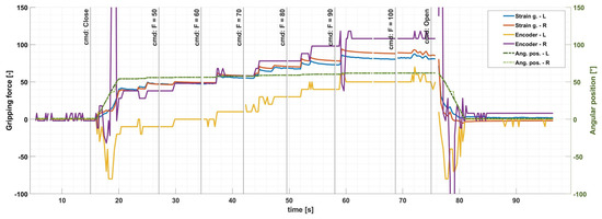The processing unit of the gripper handles both force estimation methods for the two fingers, meaning altogether four real-time, continuously submitted force values and two angular positions during operation. The purple and yellow lines in Figure 9 and Figure 10 show encoder-based force estimation while the red and blue lines show strain gauge-based data.