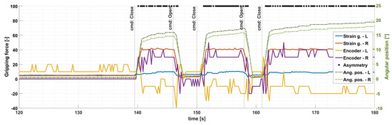 Graph of the clamping force measured on the fingers, and angular position measurements when the target object is off-center. The object (a pig’s leg) is initially positioned to the right; hence, the right-side force values increase while the left-side values merely become noisy (due to the mechanical connection between the two sides). The black lines at the top of the graph (labeled “Asymmetry”) denote the time-points when the device detected asymmetry and triggered a real-time warning to the system. The unit of the left-side Y axis strongly correlates to Newtons; however, due to uncompensated non-linearity at higher forces, the use of standard units might not be accurate.