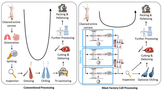 - de Medeiros Esper, I.; From, P.J.; Mason, A. Robotisation and intelligent systems in abattoirs. Trends Food Sci. Technol. 2021, 108, 214–222. [Google Scholar] [CrossRef]