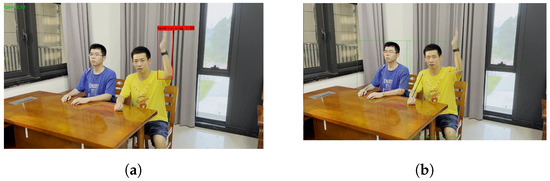 These images are the visualization results of two different methods. (a) Merely hand-raising recognition. (b) With skeleton information.