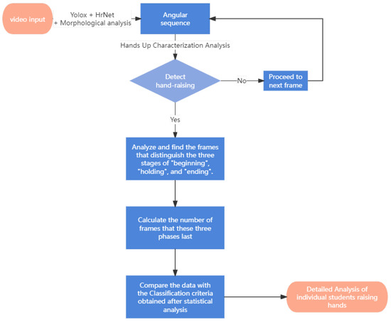 To better study the characteristics of hand-raising with different amplitudes and speeds, the data used in this study consisted of videos specifically recorded by researchers. These included videos of single-person, single-time hand-raising; single-person, multiple-time hand-raising; multiple-person, single-time hand-raising; and multiple-person, simultaneous hand-raising. These videos are equivalent to recording information in a video monitoring system. The method used in this experiment first uses the deep learning models YOLOX [20,21] and HrNet [22] to obtain the skeleton estimation results of students. Based on the skeleton estimation results, the morphological analysis method is used to calculate the key measurements (such as the area formed by the arm joint and the angle formed by it) that can describe the hand-raising action of the student in the current frame. The hand-raising action is successfully recognized and the complete hand-raising action is divided into three stages: “beginning”, “holding”, and “ending”. The speed and amplitude of raising hands are analyzed in more detail, achieving the task of detailed classification of hand-raising action. This is crucial for smart classrooms because it not only allows comparison of the enthusiasm of raising hands among multiple students raising hands simultaneously but also provides structured data (the number of times a student raises his/her hand and the corresponding speed and amplitude, i.e., enthusiasm information) that can be saved for subsequent analysis and teacher intervention after class. The main highlight of this article is to address the problem of “how to choose a more suitable student from a large number of students who raise their hands to answer the teacher” by proposing a method that converts student skeleton key point information into several one-dimensional time series using morphology-based analysis and analyzes them to achieve classification and recognition of different hand-raising amplitudes and speeds. Figure 3 shows a detailed angular analysis flowchart, in which angular sequence is first extracted by using Yolox and HrNet network, after morphological analysis. Then the sequence goes to the next process of detecting hand-raising behavior. If such behavior is detected, the sequence is analyzed to obtain the frames that distinguish the three stages of “beginning”, “holding”, and “ending”. After that, the duration of these three phases can be calculated in terms of the number of frames. These durations can then be compared to the classification criteria obtained from statistical analysis, allowing for a more detailed analysis of hand-raising behavior.