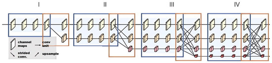 Skeleton estimation network, HRNet. In the first stage there is only one convolutional stream with the highest resolution, and a new lower resolution tributary is added after entering the next stage, and they are parallelized. For each new parallel DC, the resolution is halved and the number of channels is doubled.