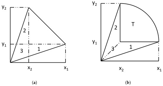 First consider the three shapes that are most used, which are vertical strips, horizontal strips, and polar triangles. These lead to , , and for the areas marked 1, 2, and 3 in the figures. As shown in Figure 7, for the convenience of calculating the area, an important assumption is that the vertex in the lower-left corner is the origin; that is, .