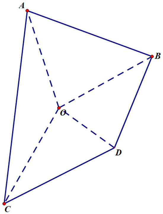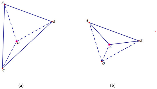 First, for any triangle, in order to calculate its signed area (with the convention that clockwise orientation is positive), it can be decomposed into the sum of the signed areas (with clockwise orientation still being positive) of multiple triangles. Here, O is taken as the origin, as shown in Figure 8. If the origin is inside triangle , as is shown in the left subfigure in Figure 8, the triangle is divided into three sub-triangles by the dashed lines, namely , , and . The signed area of triangle is equal to the sum of the signed areas of these three sub-triangles; otherwise, if the origin is outside triangle , as is shown in the right subfigure in Figure 8, the triangle is divided into three sub-triangles by the dashed lines, namely , , and . The signed area of triangle is equal to the signed area of the large triangle minus the signed areas of the remaining two small triangles and .