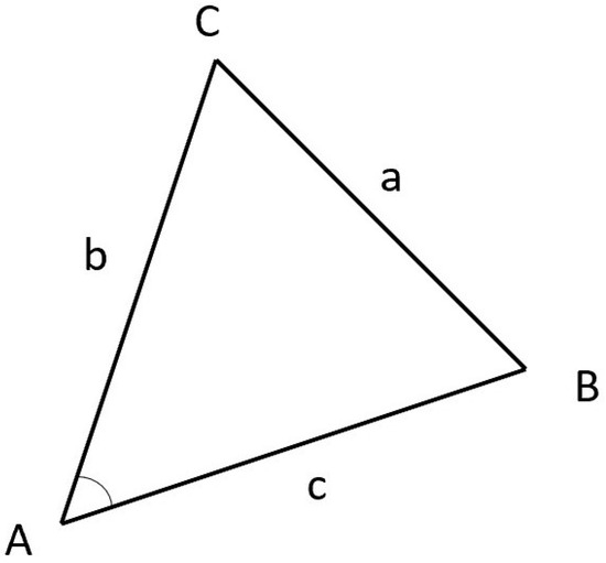 The cosine law states that—for a triangle composed of three vertices—the angle corresponding to each vertex can be calculated given the lengths of the three sides, as shown in Figure 10. In Figure 10, A, B, and C represent the three vertices; a, b, and c represent the three sides, and A, B, and C represent the three angles. By using the cosine law, the angles of the three vertices can be calculated.