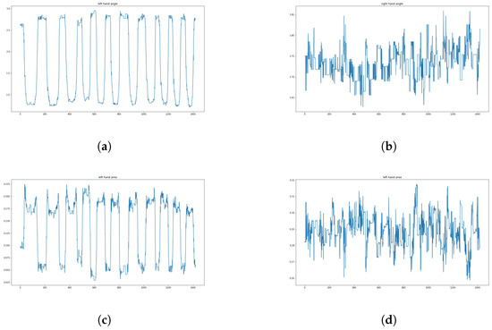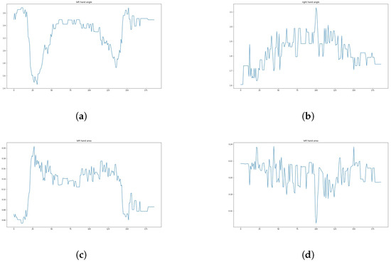 Visualization results of the feature sequence studied in this paper. (a) The angle sequence of the left elbow. (b) The angle sequence of the right elbow. (c) The left arm area sequence. (d) The right arm area sequence.