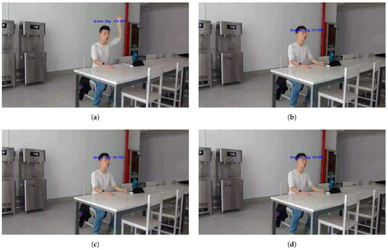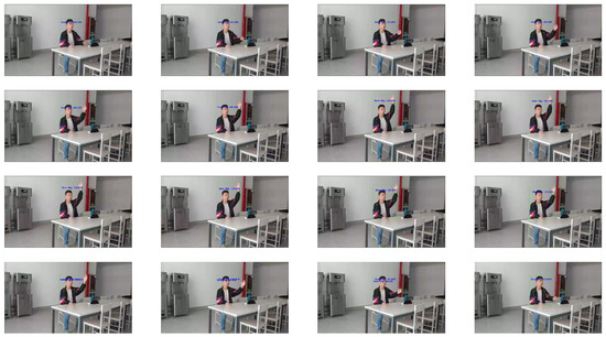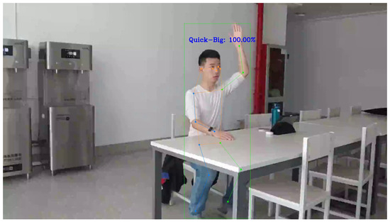 For the method of neural networks, researchers usually use it to obtain a rough classification of actions, as shown in Table 2 and Table 3. In this study, the same network structure, ST-GCN, was used for recognizing detailed sub-actions, but the experimental results were very poor. In Figure 15, for the same video, the student’s hand-raising action was described in detail as “fast speed—large amplitude”, but in the adjacent frames when the student finished the hand-raising action, the neural network recognition result jumped and the speed was recognized as “medium speed”.