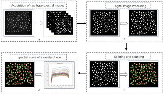During the scanning process, the rice grains were evenly distributed across the plates, which were covered with light-absorbing material to minimize reflections and ensure uniform illumination conditions. The hyperspectral information of the rice grains on each plate was then systematically captured as the linear stage moved within the imaging system, resulting in a full scan of all the samples. The process is shown in Figure 1. This meticulous setup and procedure ensured that high-quality hyperspectral data were obtained for the subsequent analysis.
