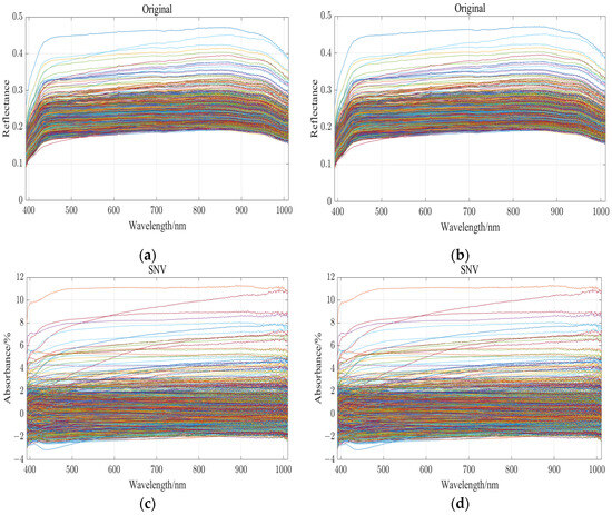 During the acquisition of hyperspectral data, instrumental and environmental factors can affect the quality and accuracy of the data to varying degrees. To mitigate these effects and improve the reliability of the data, the raw images were subjected to pre-processing techniques including Multiplicative Scatter Correction (MSC) [17], smoothing [18] and Standard Normal Variation (SNV) [19]. These methods are designed to reduce the impact of extraneous variables on the data [20]. Smoothing is a key preprocessing step in hyperspectral data analysis aimed at improving the signal-to-noise ratio. The technique effectively reduces a wide range of noise that may come from environmental factors such as instruments, air or other sources. Smoothing reduces the impact of these noise factors by averaging the data locally or globally. This process involves averaging the data points within a specified neighborhood or across the entire dataset to reduce the effects of outliers and random noise. As a result, the data become smoother, which simplifies further analysis and processing. Smoothing not only improves the quality of the data, but also helps to extract meaningful information, and is therefore an important step in the pre-preparation of the hyperspectral data for detailed examination and interpretation [21]. The Standard Normal Variate (SNV) transformation is a preprocessing technique used in hyperspectral data analysis to standardize each spectrum in a dataset. By adjusting the spectra to have a mean of zero and a standard deviation of one, SNV effectively reduces the intensity differences between the samples of different species. This normalization process makes the spectral data more homogeneous in terms of internal intensities, which is particularly beneficial when developing predictive models [22]. The results of using the four preprocessing techniques are shown in Figure 3. By applying these methods in concert, variations due to the internal and environmental factors within the instrument are greatly reduced and the effects of noise are mitigated, making the data more suitable for further analysis, modeling, and interpretation. To determine the optimal order in which to apply the three algorithms, we trained each algorithm independently on the same data model, and the results are shown in Table 1.
