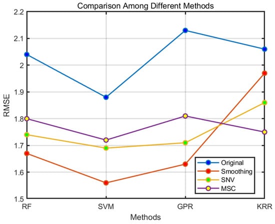 As the data in Table 1 and Figure 4 show, the results of the four different preprocessing methods differ in terms of their model training efficiency. Notably, the combination of smoothing with the support vector machine (SVM) regression algorithm produced the most favorable results, achieving a root mean square error (RMSE) of 1.56. Overall, the smoothing method performed well in reducing the error in the prediction results compared to the other preprocessing methods. In addition, the SVM model outperformed the other regression models across all the data conditions, showing a stronger performance. In view of these findings, SVM was selected as the primary regression model for data analysis. Therefore, as a preprocessing step for the hyperspectral data, Multiplicative Scatter Correction (MSC), Standard Normal Variate (SNV) and smoothing were applied sequentially.