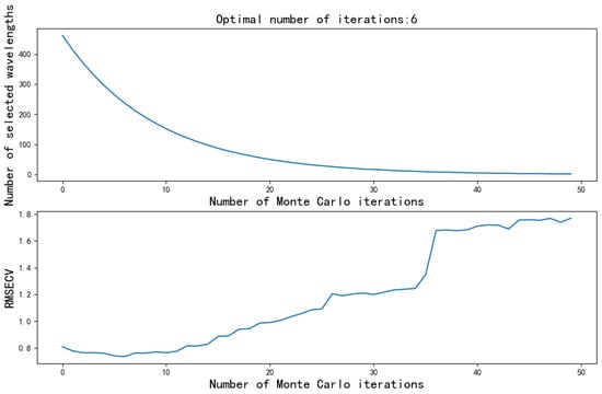 The Competitive Adaptive Weighted Sampling (CARS) algorithm is designed to identify characteristic bands in hyperspectral spectra. It uses a combination of partial least squares regression and Monte Carlo random sampling for the numerical analysis. Through cross-validation, CARS obtains sampling results with minimal cross-validated root mean square error (RMSECV). Inspired by the Darwinian principle of “survival of the fittest”, CARS introduces a variable selection algorithm to optimize the selection of spectral bands by iteratively improving the statistical information. This approach helps to efficiently identify the most informative bands, thus significantly improving the performance of hyperspectral data analysis [27,28]. Figure 5 shows the relationship between the number of Monte Carlo simulation iterations, the size of the cross-validation root mean square error (RMSECV) and the number of feature wavelengths selected. In the sixth iteration of the Monte Carlo process, the RMSECV of the algorithm reaches its lowest, and accordingly, 234 feature wavelengths were selected. This finding highlights the efficiency of the iterative process in optimizing the spectral features for the hyperspectral data analysis.