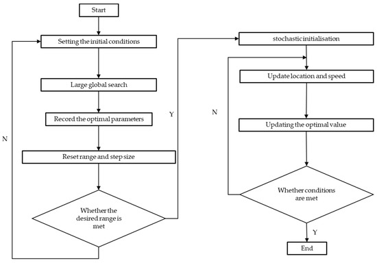 GISPSO efficiently optimizes the SVM model to ensure fast and accurate determination of the global optimum in large and complex datasets. This approach circumvents the limitation of the PSO algorithm that local optimization may occur during an extensive search and reduces the time and resource consumption of the GS algorithm. The procedure of GISPSO is shown in Figure 7.