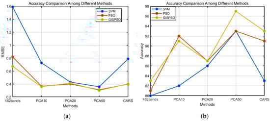 The grid-based improved PSO (GISPSO) algorithm combined with feature selection performed slightly better than the GISPSO algorithm that utilizes the full spectral band. The latter method has increased the redundancy due to the large amount of data in the full spectral bands, which affects the PSO algorithm’s pursuit of an optimal solution. In contrast, the GISPSO algorithm combined with feature selection shows stronger applicability for parameter optimization in the case of large datasets and intricate data interrelationships.